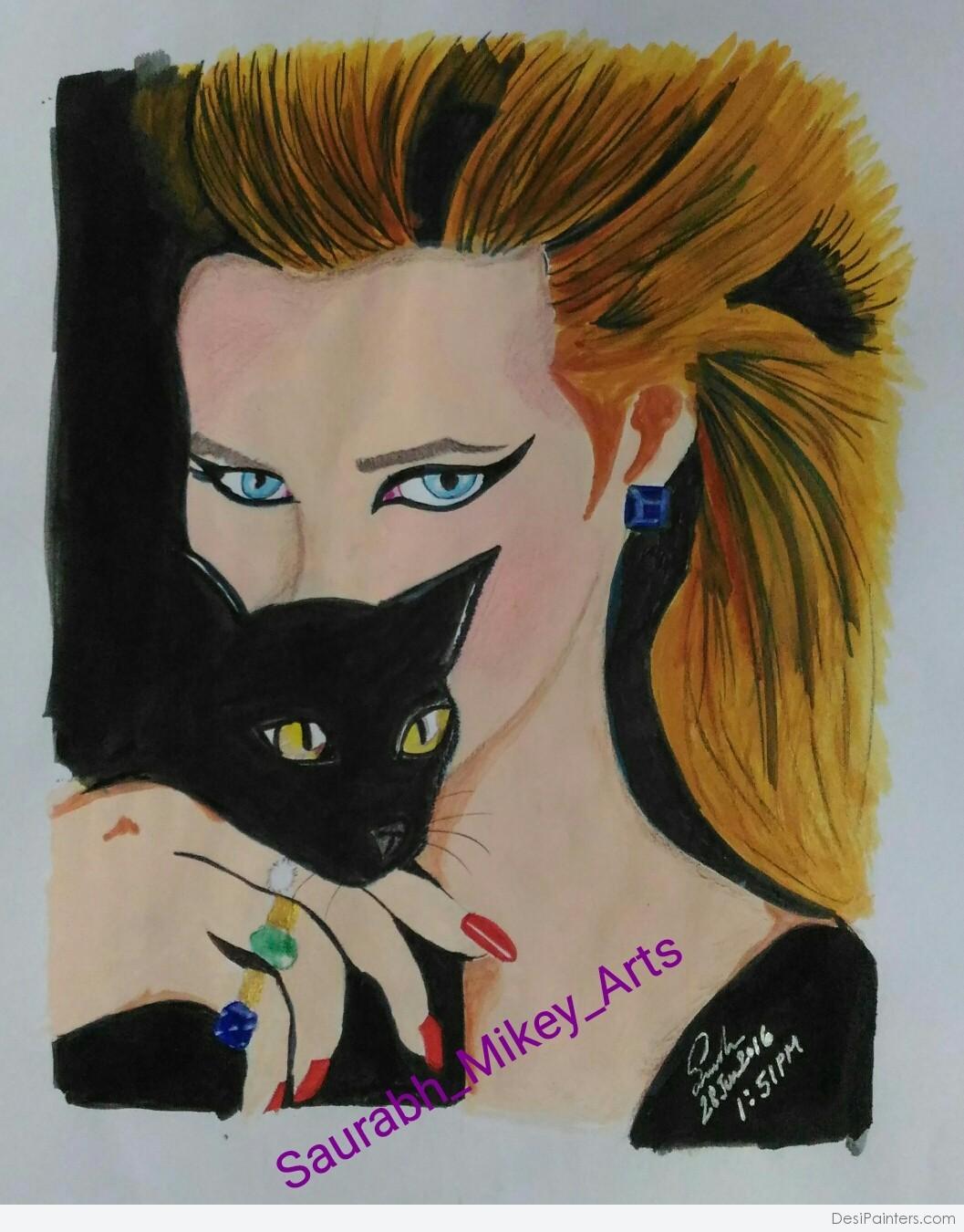 Beautiful Watercolor Painting Of Cute Girl With Cat